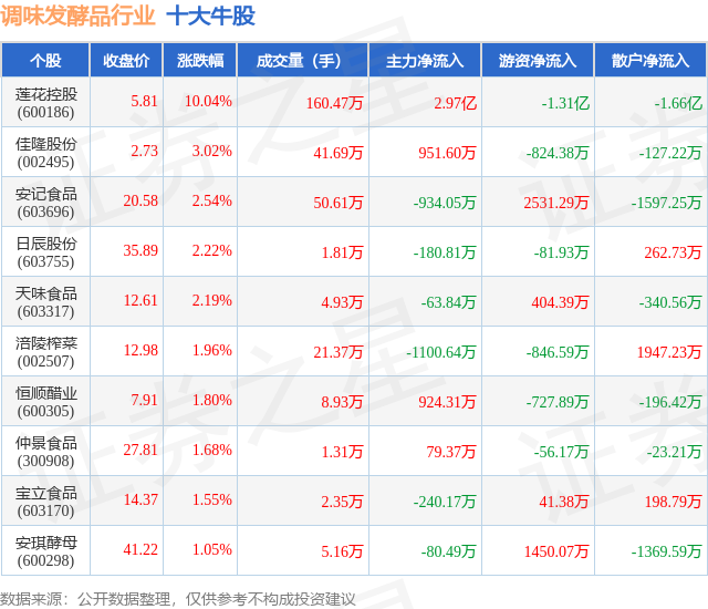 个股表现方面,调味发酵品行业当日领涨股为莲花控股(600186),该股当日报收5.81,上涨10.04%,成交量160.47万,主力资金净流入2.97亿元。佳隆股份(002495)以上涨3.02%紧随其后,该股当日成交量41.69万,主力资金净流入951.6万元。除此之外,安记食品(603696)、日辰股份(603755)、天味食品(603317)均进入当日牛股之列。具体个股列表见下表: