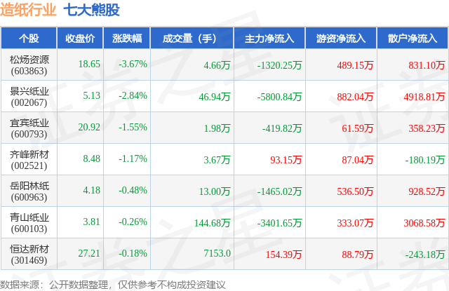 个股表现方面,造纸行业当日领跌股为松炀资源(603863),该股当日报收18.65,下跌3.67%,成交量4.66万,主力资金净流出1320.25万元。景兴纸业(002067)以下跌2.84%紧随其后,该股当日成交量46.94万,主力资金净流出5800.84万元。除此之外,宜宾纸业(600793)、齐峰新材(002521)、岳阳林纸(600963)均进入当日熊股之列。具体个股列表见下表:
