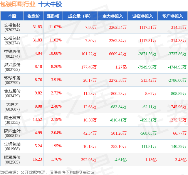 个股表现方面,包装印刷行业当日领涨股为宏裕包材(920274),该股当日报收31.83,上涨11.02%,成交量7.8万,主力资金净流入2262.34万元。宏裕包材(920274)以上涨11.02%紧随其后,该股当日成交量7.8万,主力资金净流入2262.34万元。除此之外,中锐股份(002374)、昇兴股份(002752)、环球印务(002799)均进入当日牛股之列。具体个股列表见下表: