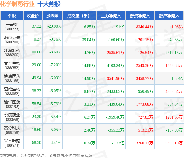 个股表现方面,化学制药行业当日领跌股为一品红(300723),该股当日报收37.32,下跌20.0%,成交量16.85万,主力资金净流出1.91亿元。退市苏吴(600200)以下跌9.76%紧随其后,该股当日成交量39.04万,主力资金净流出160.6万元。除此之外,泽璟制药(688266)、益方生物(688382)、博瑞医药(688166)均进入当日熊股之列。具体个股列表见下表: