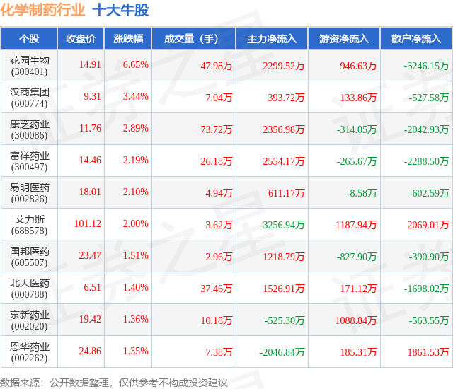 个股表现方面,化学制药行业当日领涨股为花园生物(300401),该股当日报收14.91,上涨6.65%,成交量47.98万,主力资金净流入2299.52万元。汉商集团(600774)以上涨3.44%紧随其后,该股当日成交量7.04万,主力资金净流入393.72万元。除此之外,康芝药业(300086)、富祥药业(300497)、易明医药(002826)均进入当日牛股之列。具体个股列表见下表: