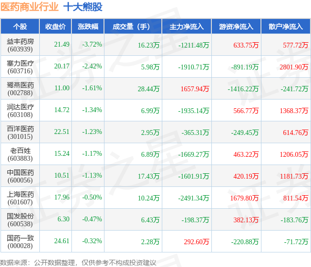 个股表现方面,医药商业行业当日领跌股为益丰药房(603939),该股当日报收21.49,下跌3.72%,成交量16.23万,主力资金净流出1211.48万元。塞力医疗(603716)以下跌2.42%紧随其后,该股当日成交量5.98万,主力资金净流出1910.71万元。除此之外,鹭燕医药(002788)、润达医疗(603108)、百洋医药(301015)均进入当日熊股之列。具体个股列表见下表: