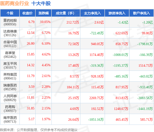 个股表现方面,医药商业行业当日领涨股为重药控股(000950),该股当日报收6.79,上涨10.05%,成交量212.72万,主力资金净流入2.61亿元。达嘉维康(301126)以上涨6.72%紧随其后,该股当日成交量16.79万,主力资金净流出722.49万元。除此之外,合富中国(603122)、嘉事堂(002462)、漱玉平民(301017)均进入当日牛股之列。具体个股列表见下表: