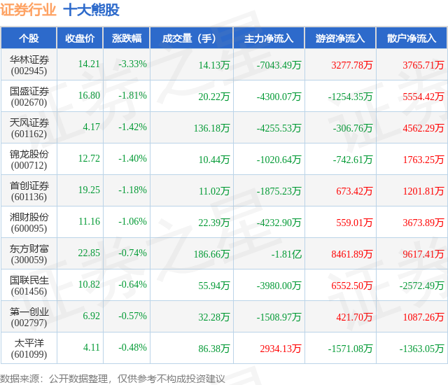 个股表现方面,证券行业当日领跌股为华林证券(002945),该股当日报收14.21,下跌3.33%,成交量14.13万,主力资金净流出7043.49万元。国盛证券(002670)以下跌1.81%紧随其后,该股当日成交量20.22万,主力资金净流出4300.07万元。除此之外,天风证券(601162)、锦龙股份(000712)、首创证券(601136)均进入当日熊股之列。具体个股列表见下表: