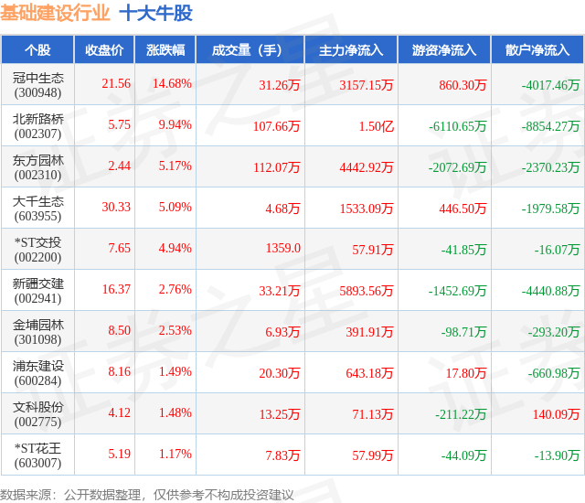 个股表现方面,基础建设行业当日领涨股为冠中生态(300948),该股当日报收21.56,上涨14.68%,成交量31.26万,主力资金净流入3157.15万元。北新路桥(002307)以上涨9.94%紧随其后,该股当日成交量107.66万,主力资金净流入1.5亿元。除此之外,东方园林(002310)、大千生态(603955)、*ST交投(002200)均进入当日牛股之列。具体个股列表见下表:
