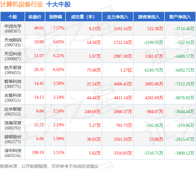 个股表现方面,计算机设备行业当日领涨股为中润光学(688307),该股当日报收49.01,上涨7.57%,成交量9.23万,主力资金净流入3192.16万元。天地数码(300743)以上涨6.65%紧随其后,该股当日成交量14.58万,主力资金净流入1722.54万元。除此之外,天迈科技(300807)、航天智装(300455)、智莱科技(300771)均进入当日牛股之列。具体个股列表见下表: