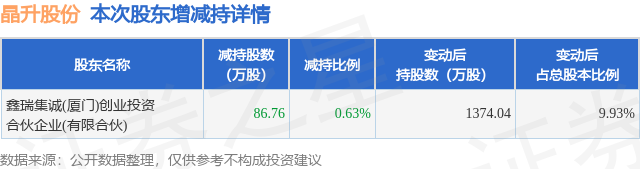 证券之星消息,12月15日晶升股份发布公告《晶升股份:南京晶升装备股份有限公司关于持股5%以上股东减持计划时间届满暨减持股份结果公告》,其股东鑫瑞集诚(厦门)创业投资合伙企业(有限合伙)于2025年12月11日至2025年12月12日间合计减持86.76万股,占公司目前总股本的0.627%,变动期间该股股价上涨1.79%,截止12月12日收盘报37.04元。