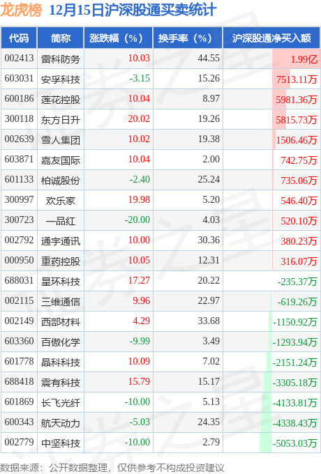 龙虎榜中有沪股通/深股通专用席位(北向资金)现身的个股共24家,其中雷科防务以净买入1.99亿元排名第一。详情见下表:
