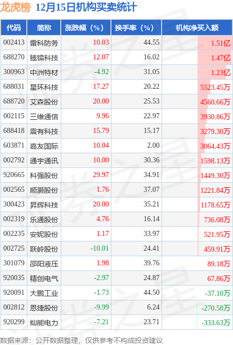 当日公布的交易所龙虎榜中有机构专用席位现身的个股共34家,其中雷科防务以净买入1.51亿元排名第一。详情见下表: