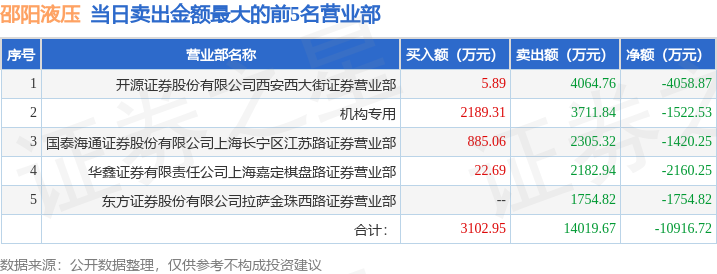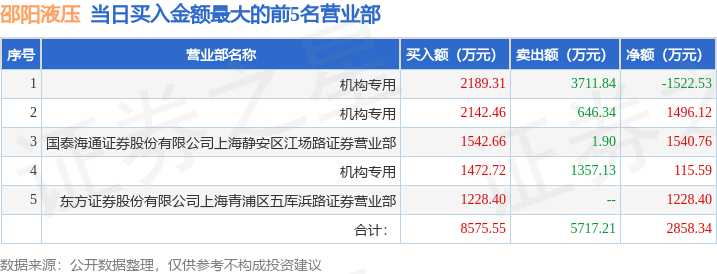 证券之星消息,沪深交易所2025年12月15日公布的交易公开信息显示,邵阳液压(301079)因日换手率达到30%的前5只证券登上龙虎榜。此次是近5个交易日内第1次上榜。