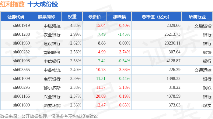 证券之星消息,12月15日,红利指数(000015)报收于3020.97点,涨0.75%,成交288.43亿元,换手率0.23%。当日该指数成份股中,上涨的有29家,中粮糖业以9.99%的涨幅领涨,下跌的有19家,沪农商行以2.46%的跌幅领跌。