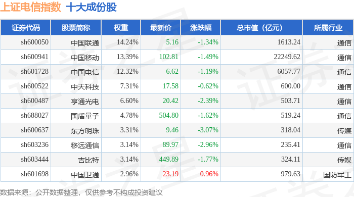 证券之星消息,12月15日,上证电信(000040)指数报收于3829.73点,跌2.13%,成交300.58亿元,换手率0.77%。当日该指数成份股中,上涨的有7家,南方传媒以2.09%的涨幅领涨,下跌的有25家,仕佳光子以10.49%的跌幅领跌。