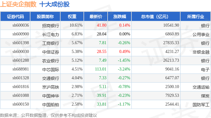 上证央企(000042)指数十大成份股详情如下: