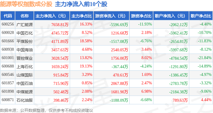 资金流向方面,能源等权(000070)指数成份股当日主力资金净流出合计5541.6万元,游资资金净流入合计1.49亿元,散户资金净流出合计9392.64万元。成份股资金流向详情见下表: