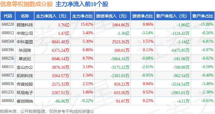 资金流向方面,信息等权(000077)指数成份股当日主力资金净流出合计61.68亿元,游资资金净流入合计24.65亿元,散户资金净流入合计37.02亿元。成份股资金流向详情见下表: