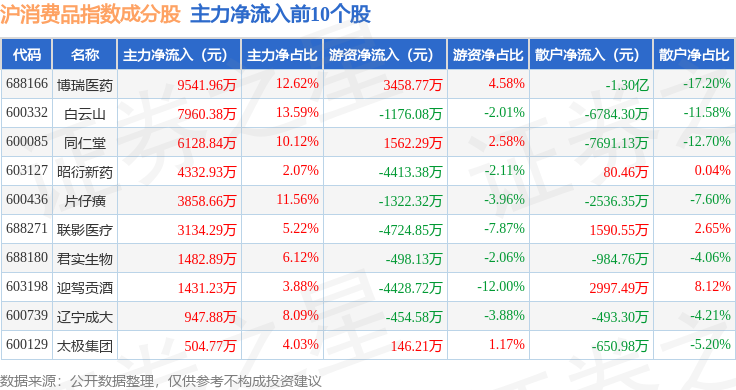 资金流向方面,沪消费品(000103)指数成份股当日主力资金净流出合计7.94亿元,游资资金净流入合计4.59亿元,散户资金净流入合计3.35亿元。成份股资金流向详情见下表: