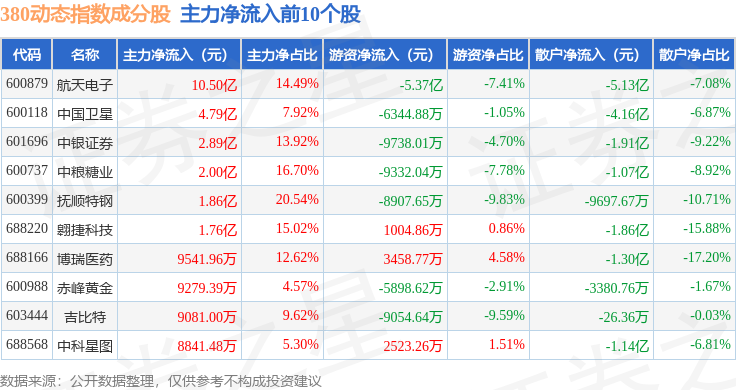 资金流向方面,380动态(000141)指数成份股当日主力资金净流出合计24.66亿元,游资资金净流入合计5.16亿元,散户资金净流入合计19.49亿元。成份股资金流向详情见下表: