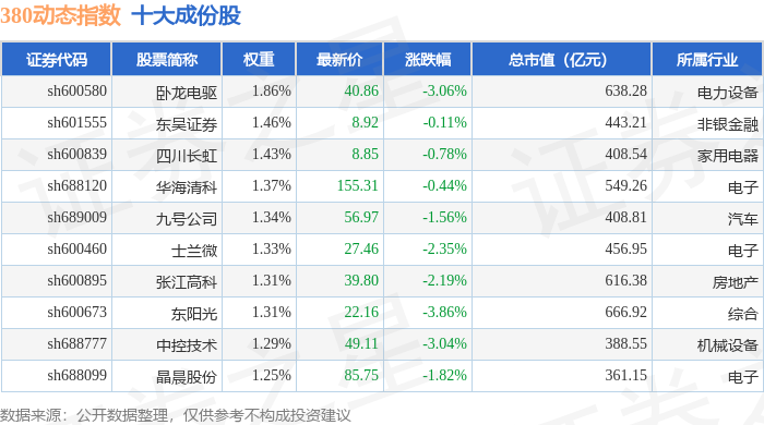 证券之星消息,12月15日,380动态(000141)指数报收于3716.94点,跌0.94%,成交1191.35亿元,换手率1.78%。当日该指数成份股中,上涨的有54家,固德威以12.36%的涨幅领涨,下跌的有127家,芯原股份以11.7%的跌幅领跌。