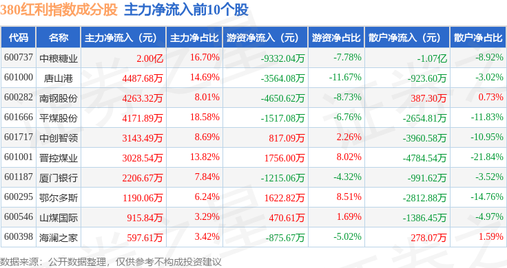 资金流向方面,380红利(000150)指数成份股当日主力资金净流入合计4273.17万元,游资资金净流出合计1.43亿元,散户资金净流入合计9991.24万元。成份股资金流向详情见下表:
