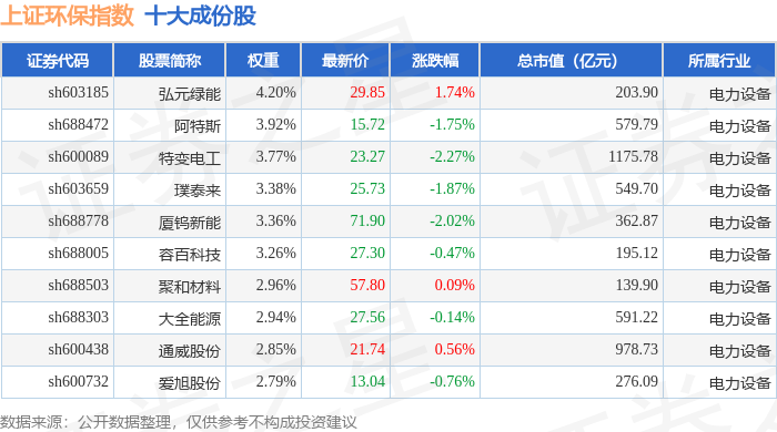 上证环保(000158)指数十大成份股详情如下: