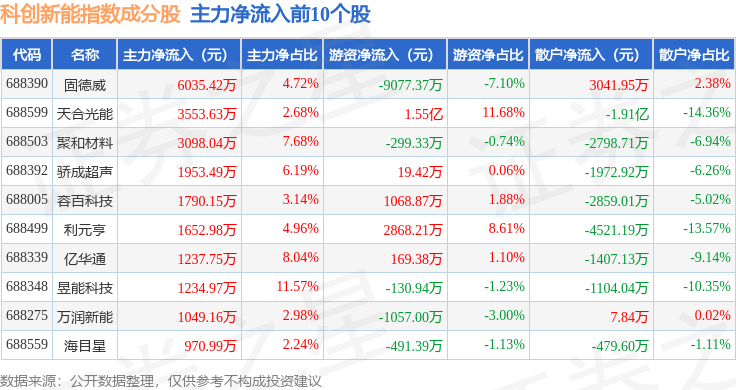 资金流向方面,科创新能(000692)指数成份股当日主力资金净流出合计2.44亿元,游资资金净流入合计3.77亿元,散户资金净流出合计1.33亿元。成份股资金流向详情见下表: