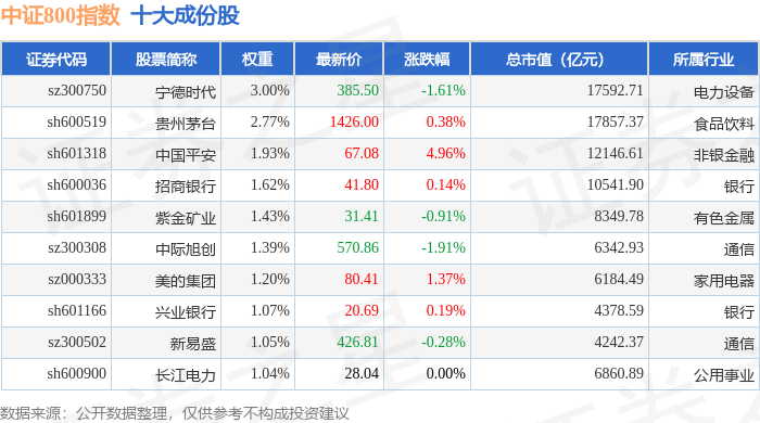 中证800(000906)指数十大成份股详情如下: