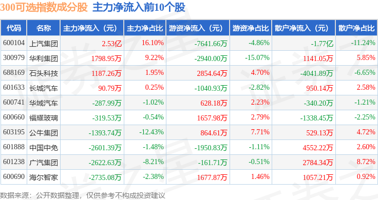 资金流向方面,300可选(000911)指数成份股当日主力资金净流出合计17.05亿元,游资资金净流入合计5.46亿元,散户资金净流入合计11.59亿元。成份股资金流向详情见下表: