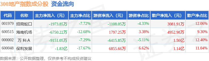 资金流向方面,300地产(000952)指数成份股当日主力资金净流出合计3.62亿元,游资资金净流入合计1129.0万元,散户资金净流入合计3.5亿元。成份股资金流向详情见下表: