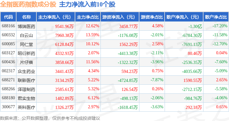 资金流向方面,全指医药(000991)指数成份股当日主力资金净流出合计14.86亿元,游资资金净流入合计4.38亿元,散户资金净流入合计9.71亿元。成份股资金流向详情见下表: