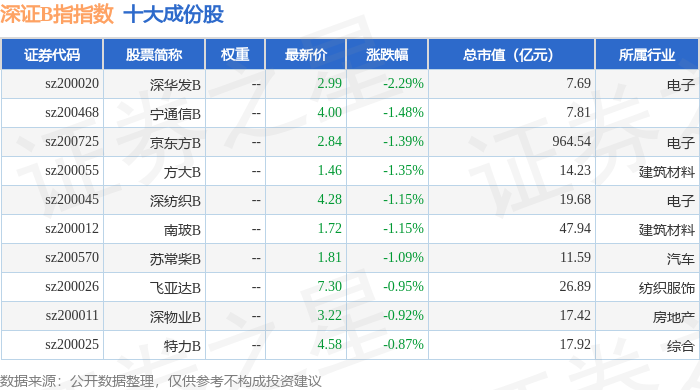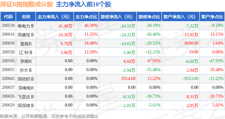 资金流向方面,深证B指(399108)指数成份股当日主力资金净流出合计274.2万元,游资资金净流入合计27.55万元,散户资金净流入合计246.65万元。成份股资金流向详情见下表:
