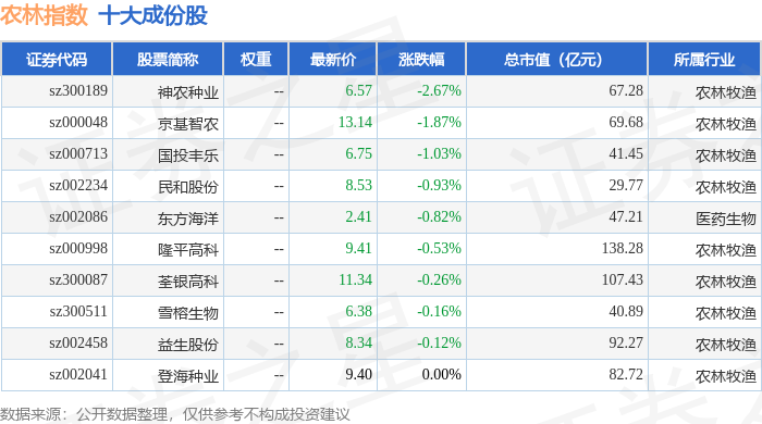 资金流向方面,农林指数(399231)成份股当日主力资金净流出合计7257.14万元,游资资金净流入合计3571.39万元,散户资金净流入合计3685.75万元。成份股资金流向详情见下表: