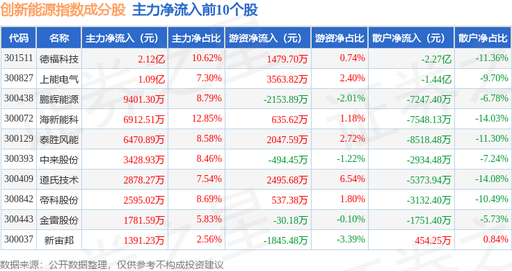 资金流向方面,创新能源(399266)指数成份股当日主力资金净流出合计24.92亿元,游资资金净流入合计5.77亿元,散户资金净流入合计19.15亿元。成份股资金流向详情见下表: