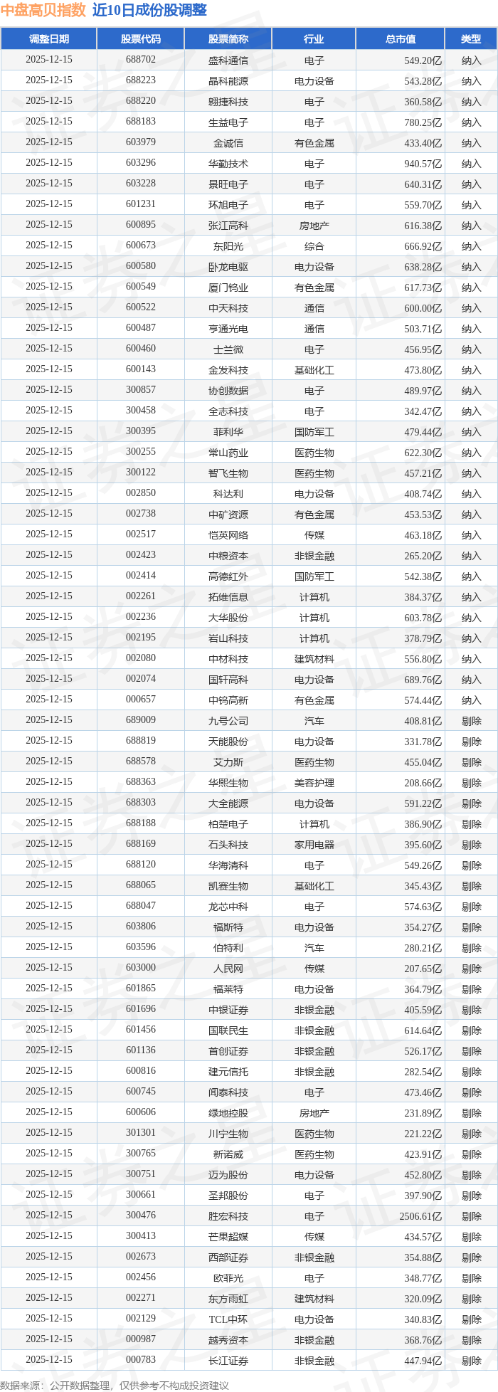 近10日内中盘高贝(399407)指数成份股做了调整,新纳入了32只股票,剔除了32只股票。