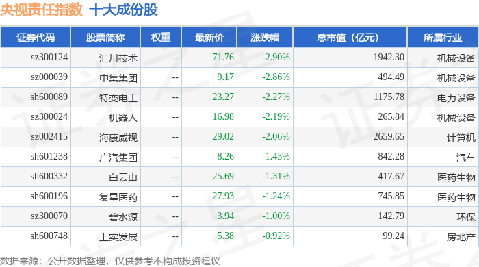 证券之星消息,12月15日,央视责任(399555)指数报收于5325.75点,涨0.03%,成交560.06亿元,换手率0.64%。当日该指数成份股中,上涨的有24家,环旭电子以5.17%的涨幅领涨,下跌的有23家,汇川技术以2.9%的跌幅领跌。