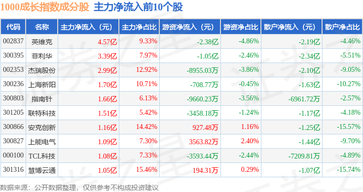 资金流向方面,1000成长(399630)指数成份股当日主力资金净流出合计141.35亿元,游资资金净流入合计25.82亿元,散户资金净流入合计115.53亿元。成份股资金流向详情见下表: