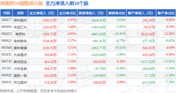 资金流向方面,深医药50(399647)指数成份股当日主力资金净流出合计6.72亿元,游资资金净流出合计1.26亿元,散户资金净流入合计7.98亿元。成份股资金流向详情见下表: