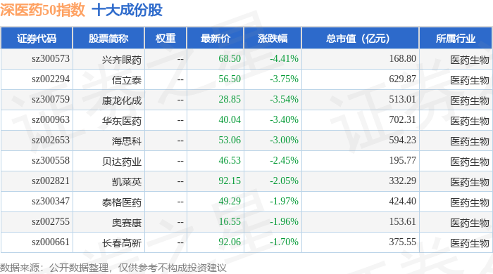 证券之星消息,12月15日,深医药50(399647)指数报收于7921.38点,跌0.97%,成交135.95亿元,换手率0.83%。当日该指数成份股中,上涨的有14家,大博医疗以4.68%的涨幅领涨,下跌的有35家,兴齐眼药以4.41%的跌幅领跌。
