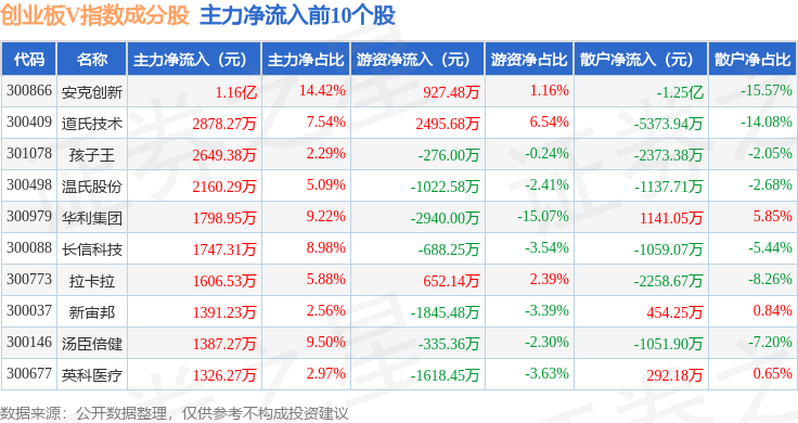 资金流向方面,创业板V(399668)指数成份股当日主力资金净流出合计48.92亿元,游资资金净流入合计7.63亿元,散户资金净流入合计41.29亿元。成份股资金流向详情见下表: