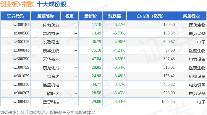 创业板V(399668)指数十大成份股详情如下: