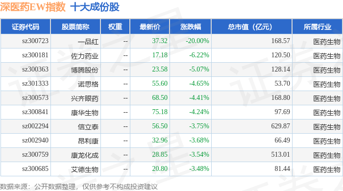 深医药EW(399676)指数十大成份股详情如下: