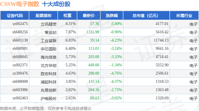 CSSW电子(399811)指数十大成份股详情如下: