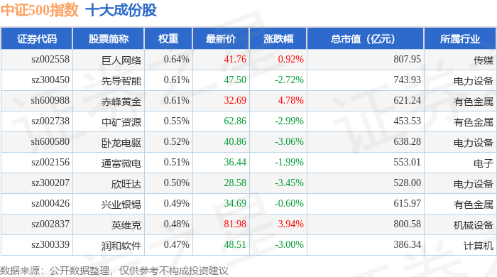 中证500(399905)指数十大成份股详情如下: