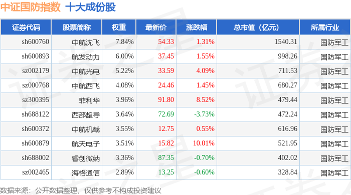 中证国防(399973)指数十大成份股详情如下: