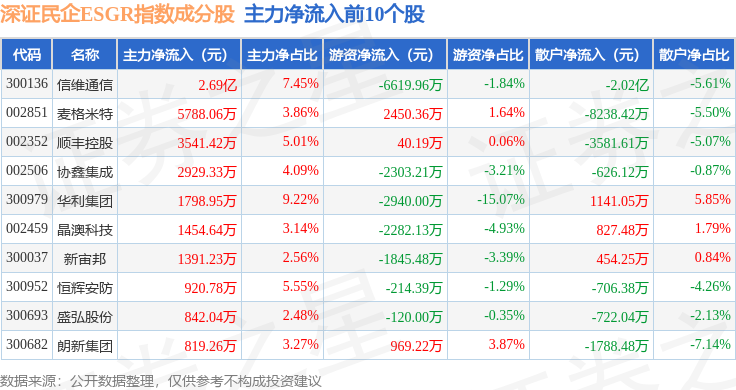 资金流向方面,深证民企ESGR(470056)指数成份股当日主力资金净流出合计61.7亿元,游资资金净流入合计14.31亿元,散户资金净流入合计47.39亿元。成份股资金流向详情见下表:
