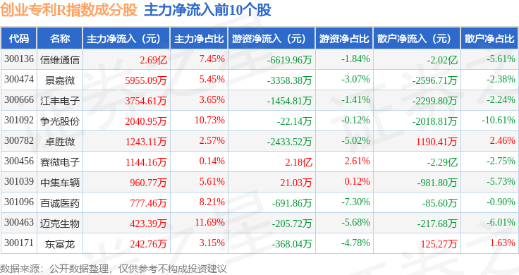 资金流向方面,创业专利R(470068)指数成份股当日主力资金净流出合计39.14亿元,游资资金净流入合计8.93亿元,散户资金净流入合计30.2亿元。成份股资金流向详情见下表: