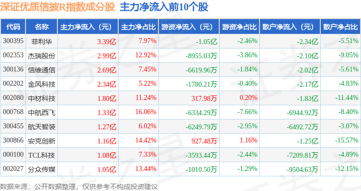 资金流向方面,深证优质信披R(470065)指数成份股当日主力资金净流出合计169.06亿元,游资资金净流入合计29.65亿元,散户资金净流入合计139.4亿元。成份股资金流向详情见下表: