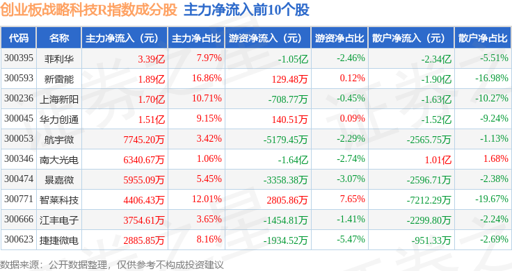 资金流向方面,创业板战略科技R(471004)指数成份股当日主力资金净流出合计3.98亿元,游资资金净流入合计6204.1万元,散户资金净流入合计3.36亿元。成份股资金流向详情见下表: