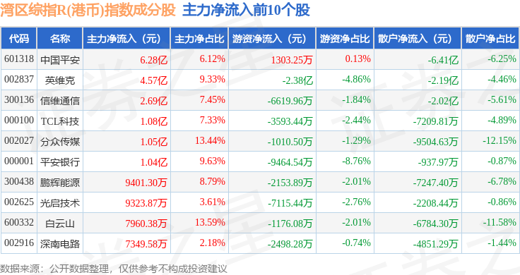 资金流向方面,湾区综指R(港币)(480004)指数成份股当日主力资金净流出合计90.27亿元,游资资金净流入合计14.07亿元,散户资金净流入合计76.22亿元。成份股资金流向详情见下表: