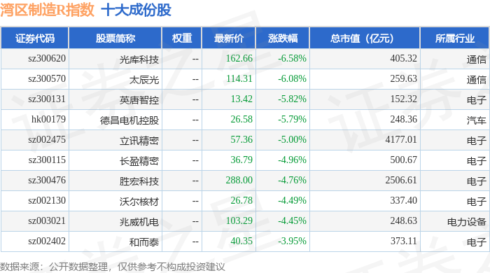 湾区制造R(480009)指数十大成份股详情如下: