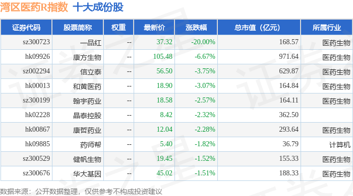 证券之星消息,12月15日,湾区医药R(480013)指数报收于2189.28点,跌2.38%,成交66.78亿元,换手率0.77%。当日该指数成份股中,上涨的有7家,固生堂以1.92%的涨幅领涨,下跌的有23家,一品红以20.0%的跌幅领跌。